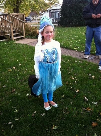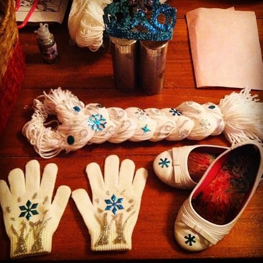 Not so bad, right? Well my 6 year old daughter, not to be out-done, decides (like every other child this year) to be Elsa from Frozen. Another easy break, since she, as a frozen fanatic, already had the dress. Thank God. But she insisted that she needed a wig since her blonde hair, that's perfectly long enough to braid, isn't white and it needed to be in order to pull of the costume. Fine. So I made her a wig out of yarn. Then, since the temperatures were supposed to be in the mid-thirties, I went ahead and dressed up some mittens for her. And just for fun, added some snowflakes to her shoes and tiara.