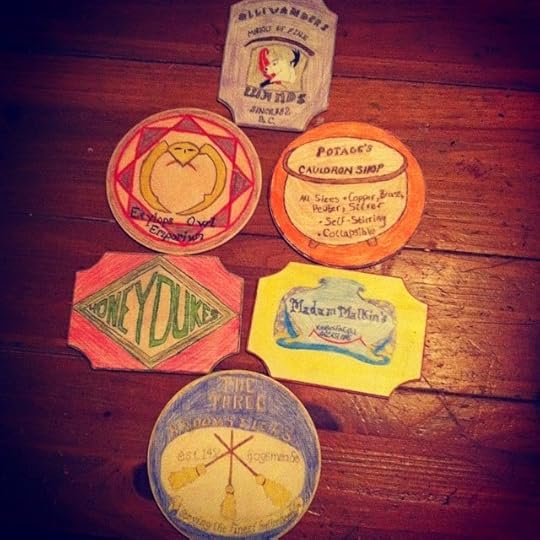 Hand-drawing the name tags for their treat bag cauldrons because even though I'm a giant nerd, I couldn't figure out how to fit the labels in my printer.Then hand-drawing the signs for all the shops they'll visit to get all their goodies.
