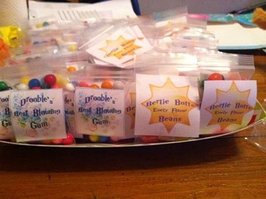 From Olivanders, they'll get their own wand, which I will describe in more detail below. From Eeylops, they'll get their own owl. From Potage's they'll get a cauldron that will serve as their goody bag. From Madam Malkin's they'll get a robe with a name tag and Hogwarts crest (which also took me days to make each one). From the 3 Broomsticks they can refresh themselves with Butterbeer, Polyjuice Potion and Hagrid's Hot Grog. Then from Honeydukes they get to choose from a variety of wizarding candies including edible wands, chocolate frogs, ton tongue taffy, Drooble's Best Blowing Gum, Bertie Botts Every Flavor Beans, etc.