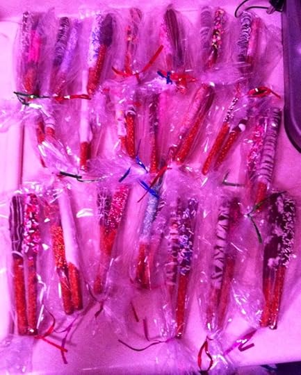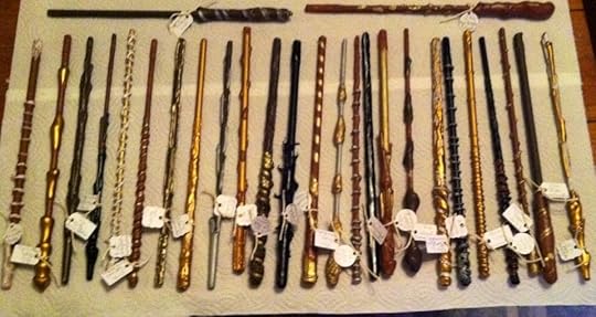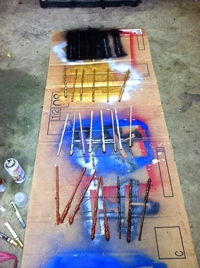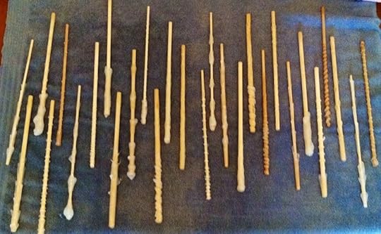 And then there's the wands. 25 kids and they all get a one and each one is completely unique. The entire process to DAYS to finish. The plan is to have them try a few out and then 'magically' turn on some twinkling Christmas lights when the wand 'picks them'.I used dowel rods, a crap-ton of hot glue, and some different paints. Then labeled each one with wood type, core type and length. For me these were the coolest thing to make. :)
