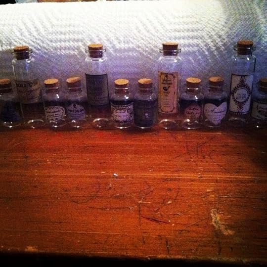 Making potions labels and vials for their potions class. My science teacher mom has graciously agreed to be the 'professor' for this class and the kids will actually be making different 'potions'.