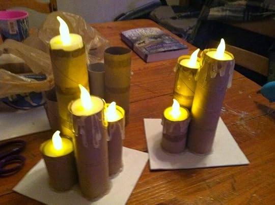 I was also going to make floating candles to hang from the ceiling but since it's going to be enough stuff to set up already the day of the party, I nixed the idea and went with tabletop candles instead. Due to the number of young kids that will most likely be running around with a sugar high, I also nixed the real candle idea. And I didn't want to buy the cheap looking battery operated pillar candles. So I got the cheap tea-light ones and made various sized pillars to put them in out of paper towel and toilet paper rolls and some more hot glue. I still haven't finished painting them but I still have five days. :)
