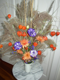 Chinese lanterns (physalis) are perfect for Fall. They’ll last and last, but eventually lose their color. I’ve been known to spray them lightly with red paint, but the odor of fresh paint is not pleasant. Tend well ahead of time and let dry in the garage.