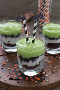 Layer brownie pieces in the bottom of each glass. Divide the brownie pieces evenly among the parfaits.
