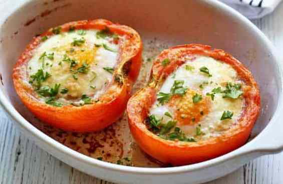 Break one egg into a small bowl or ramekin and then slide it into a tomato half. Continue this process until all 8 tomato halves are filled. Top each half with 1 tablespoon of Parmesan cheese.