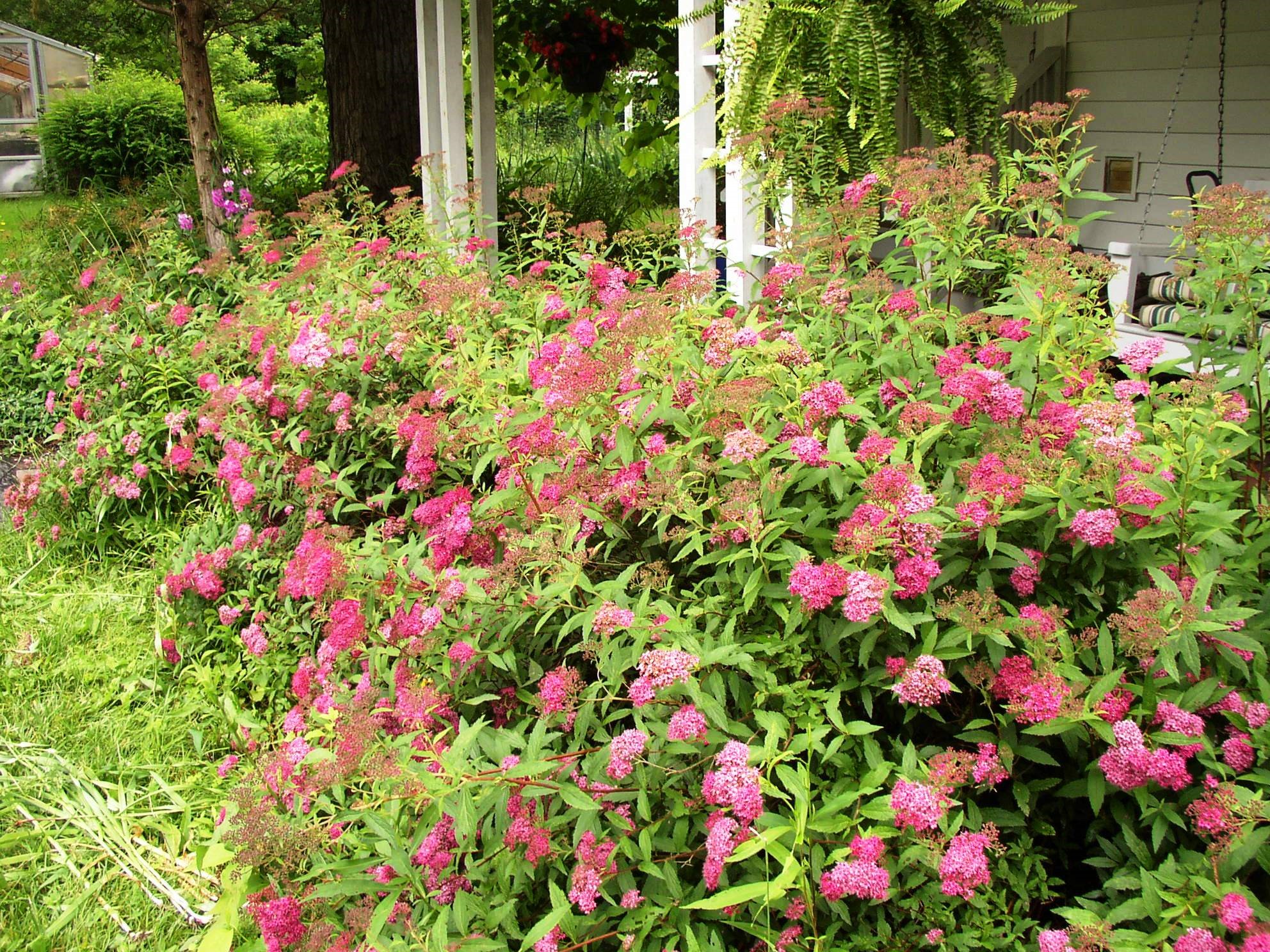 Now on the edge, native winterberry, male and female, reside happily with pink spirea, a low shrub, one of the first to bloom in the spring.