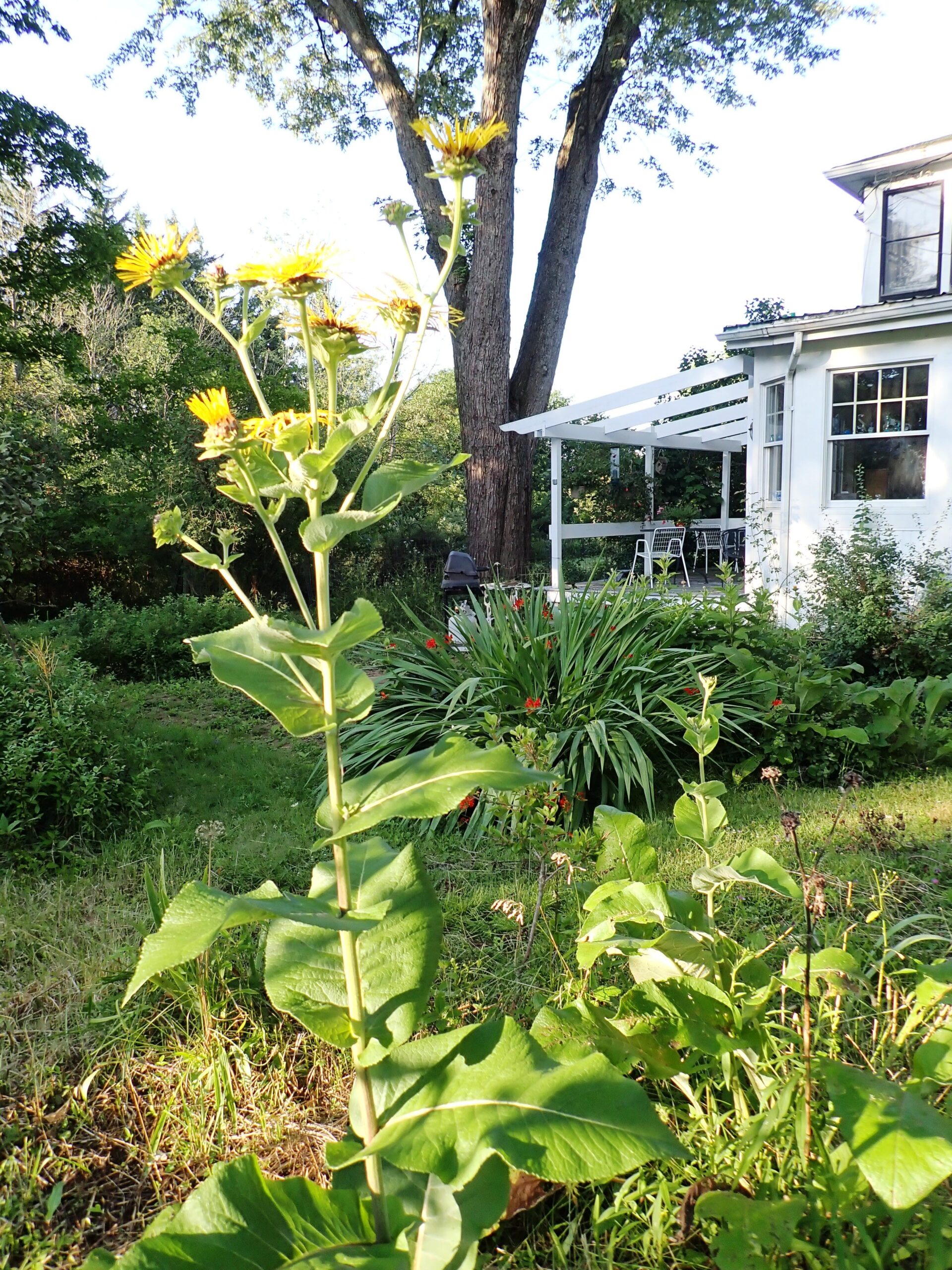 There stood the soldiers (large stalks of elecampane) arranging themselves just on the edge of the bed broadly hinting to me the root (sorry) of the problem. I am not a terrible gardener, just a bit dense. Once I dismissed the idea of that being an elm stump, everything else fell in place. Shew. Now for the solution.