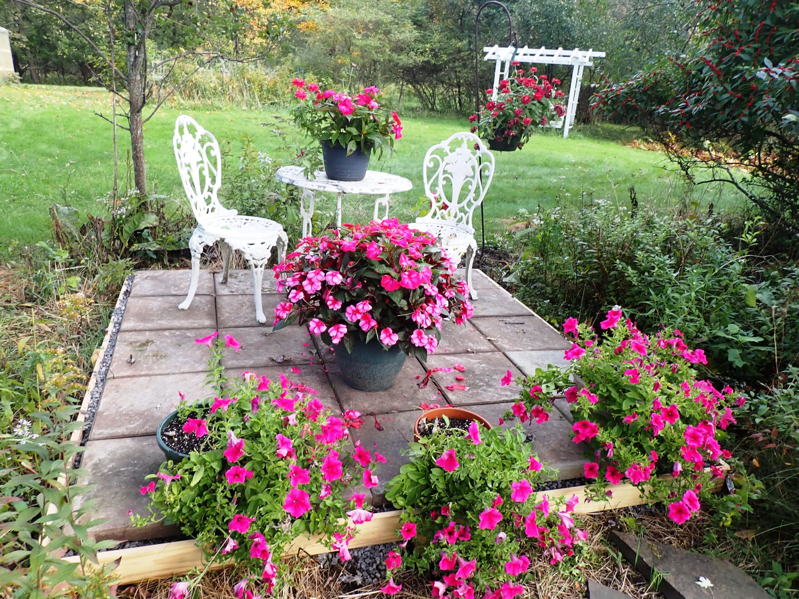 A willing creator of a mini patio for plants only has just finished placing the last of the concrete blocks. It’s still a work in progress. I need to move the large blue birdbath and more pots of flowers, but at last, I have a kitchen garden. Already I sigh with pleasure at the sight first thing in the morning.