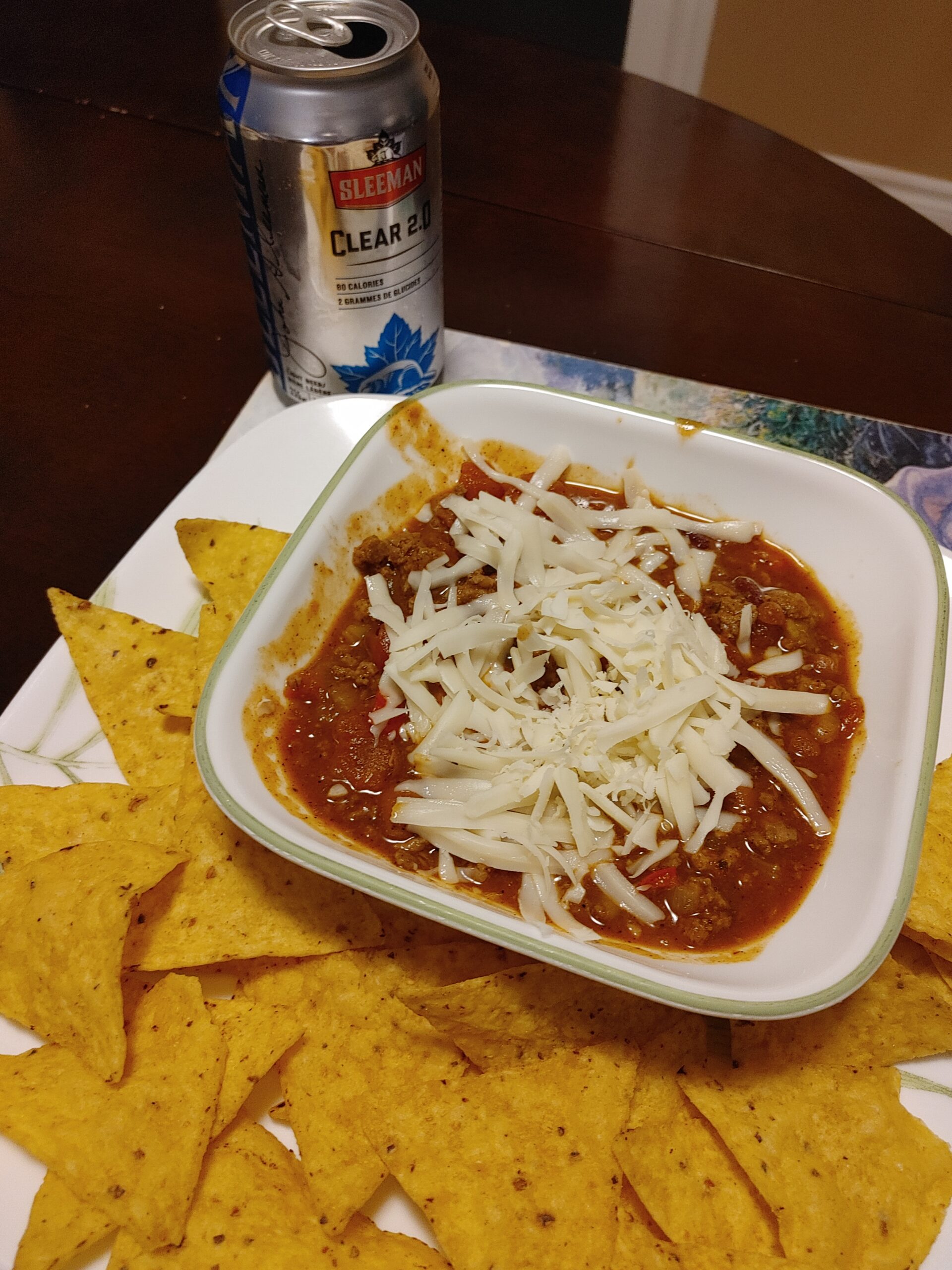 Ladle into bowls and top with shredded Cheddar cheese. Serve with nacho chips for dipping.