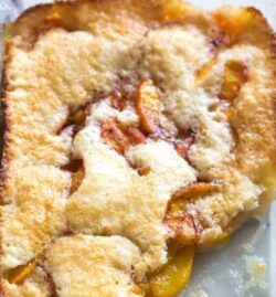 Spoon peaches and juice (or canned/glass jar peaches, if using) over batter. Sprinkle cinnamon generously over the top.