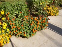 I bought bags of black top soil, some organic fertilizer, and compost. I mixed it into the sandy soil and planted marigolds, wildflowers, gladiola bulbs and some unidentified clearance flowers. They all drooped. I scattered pine bark mulch around them. The flowers still looked forlorn. Every time I watered, that night it rained. Then one night some critter ate my pansies, vinca, and moss roses. Just nibbled off the buds and left the leaves.