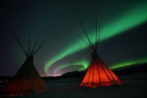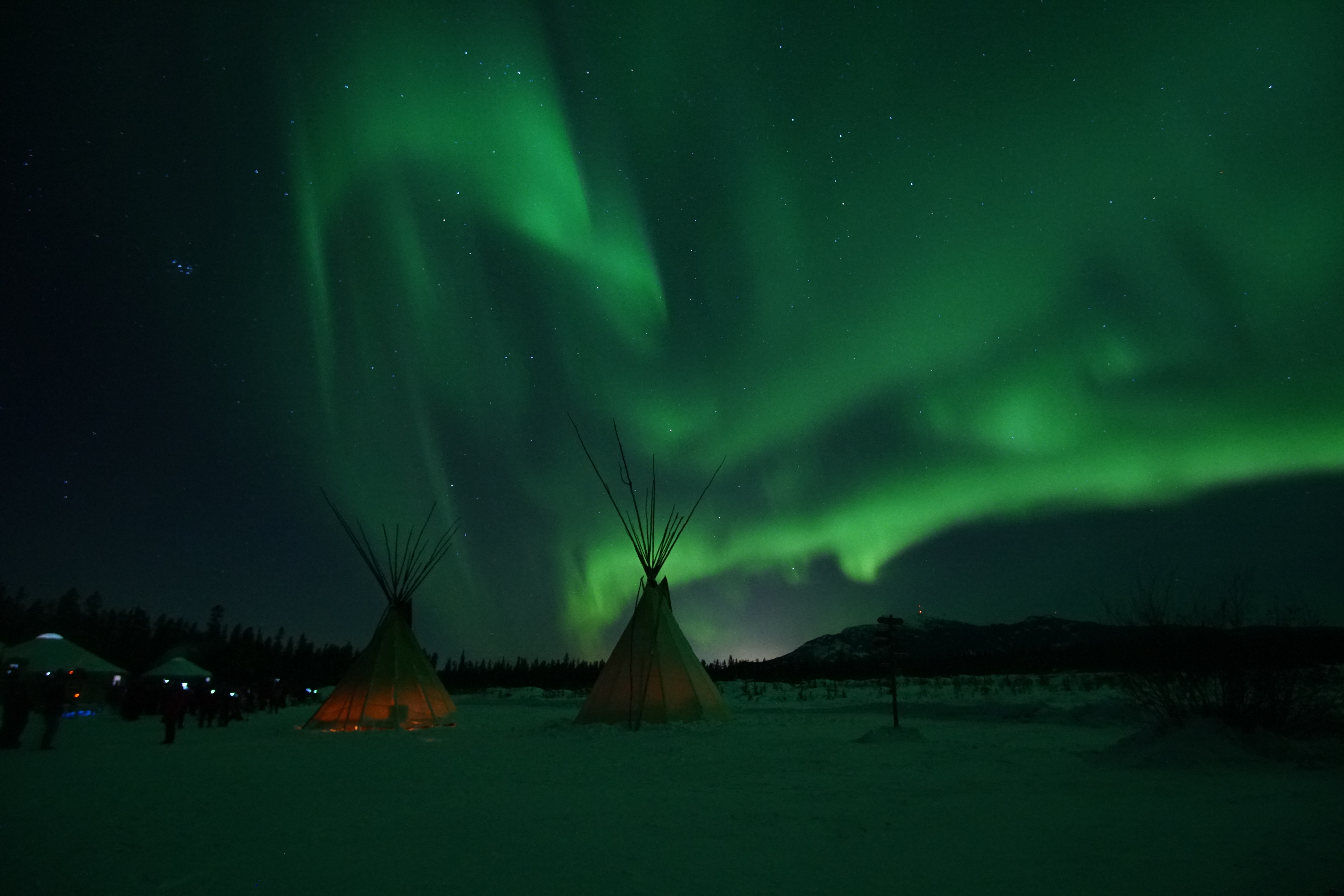 Picked up in the hotel lobby at 10:30 p.m. and adequately attired for below-zero temps, we were driven about twenty minutes south of Whitehorse. The setup included two teepees and a large heated yurt, outfitted with seating and snacks – both within steps of the outdoor viewing area equipped with numerous tripods and roving camera-savvy guides.
