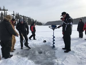 Ice fishing in a lake through 4 feet of ice takes special equipment.