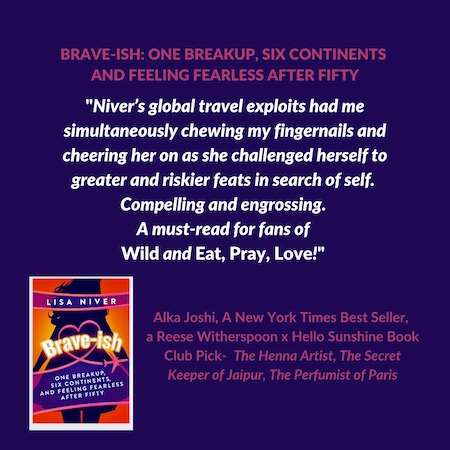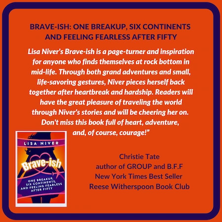 “Lisa Niver’s��Brave-ish��is a page-turner and inspiration for anyone who finds themselves at rock bottom in mid-life. Through both grand adventures and small, life-savoring gestures, Niver pieces herself back together after heartbreak and hardship. Readers will have the great pleasure of traveling the world through Niver’s stories and will be cheering her on. Don’t miss this book full of heart, adventure, and, of course, courage!” — Christie Tate, A��New York Times��Best Selling author of��Group��and��BFF, a Reese Witherspoon x Hello Sunshine Book Club Pick