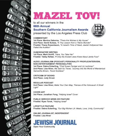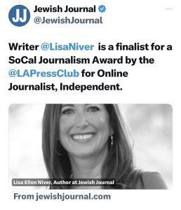 Thank you to the Jewish Journal for 13 years of support for my writing. Congrats to all of the Jewish Journal finalists in the SoCal Journalism Awards. See them all in this article: “Jewish Journal Nominated for 11 SoCal Journalism Awards by LA Press Club“
