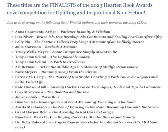 For the Hearten Book Awards–I was on the short list, then the long list, then a semi-finalist and NOW a FINALIST! What an honor to be considered for my memoir, Brave-ish!