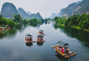From top of a bridge, looking down into the river li in Yangshuo, China. The bamboo rafts are characteristic of the region.