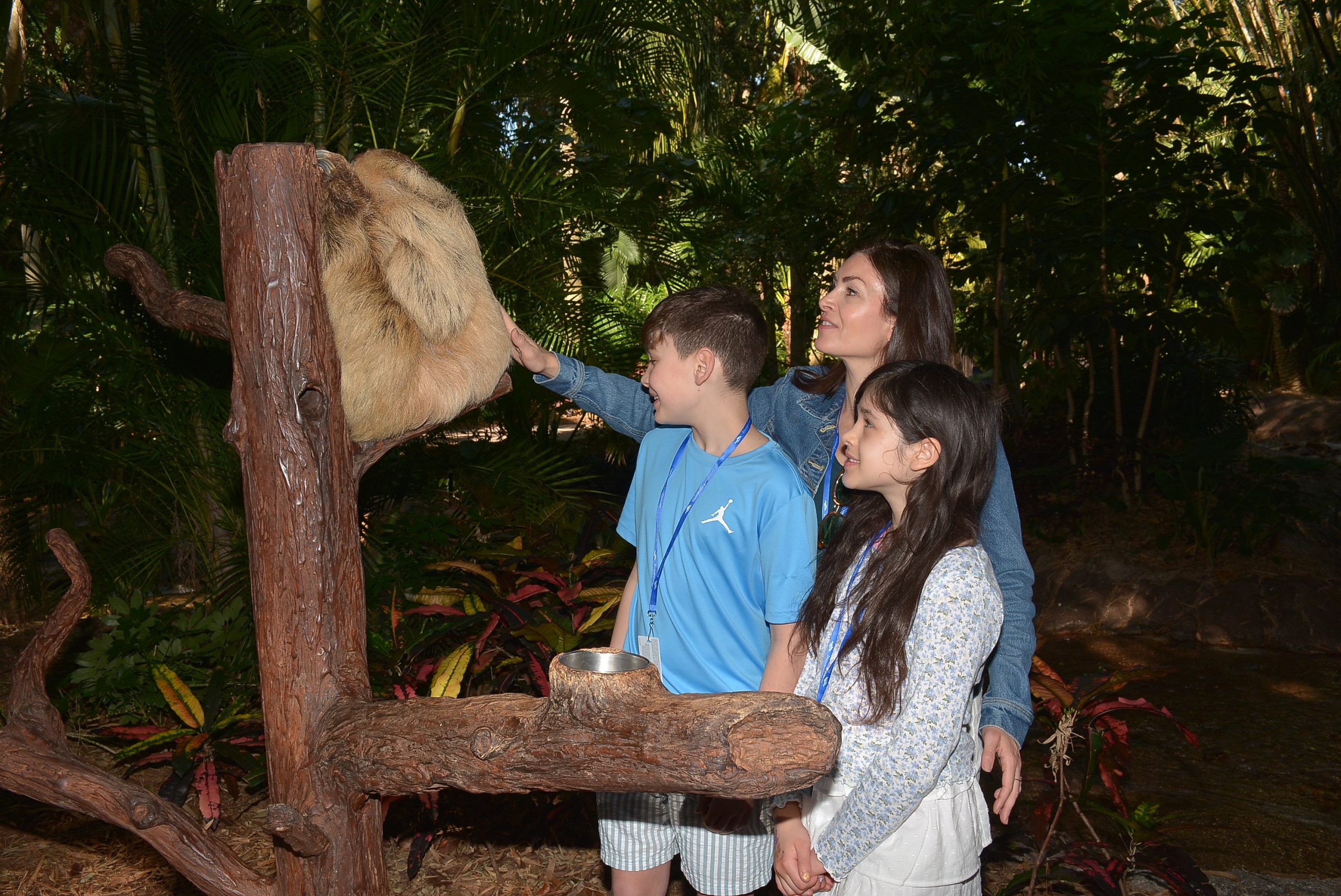 What I loved most about visiting Discovery Cove with my kids is that it is such a sensory experience: The park kept them offline and immersed in nature with hands-on learning. One of my son���s favorite animals is a sloth, and the three of us got to learn about and get close to Luey the sloth with a private 30-minute tour known as an Animal Trek. Ethan led us off the public pathways to meet our ���animal ambassador,��� a two-toed sloth, in the lush forest. My kids peppered the accompanying animal expert with questions (Question: ���Can you cut a sloth���s nails?��� Answer: ���No, that���s how they climb and hang from trees.���). We were lucky enough to pet Luey while he was awake (sloths sleep between 15 and 20 hours a day).��