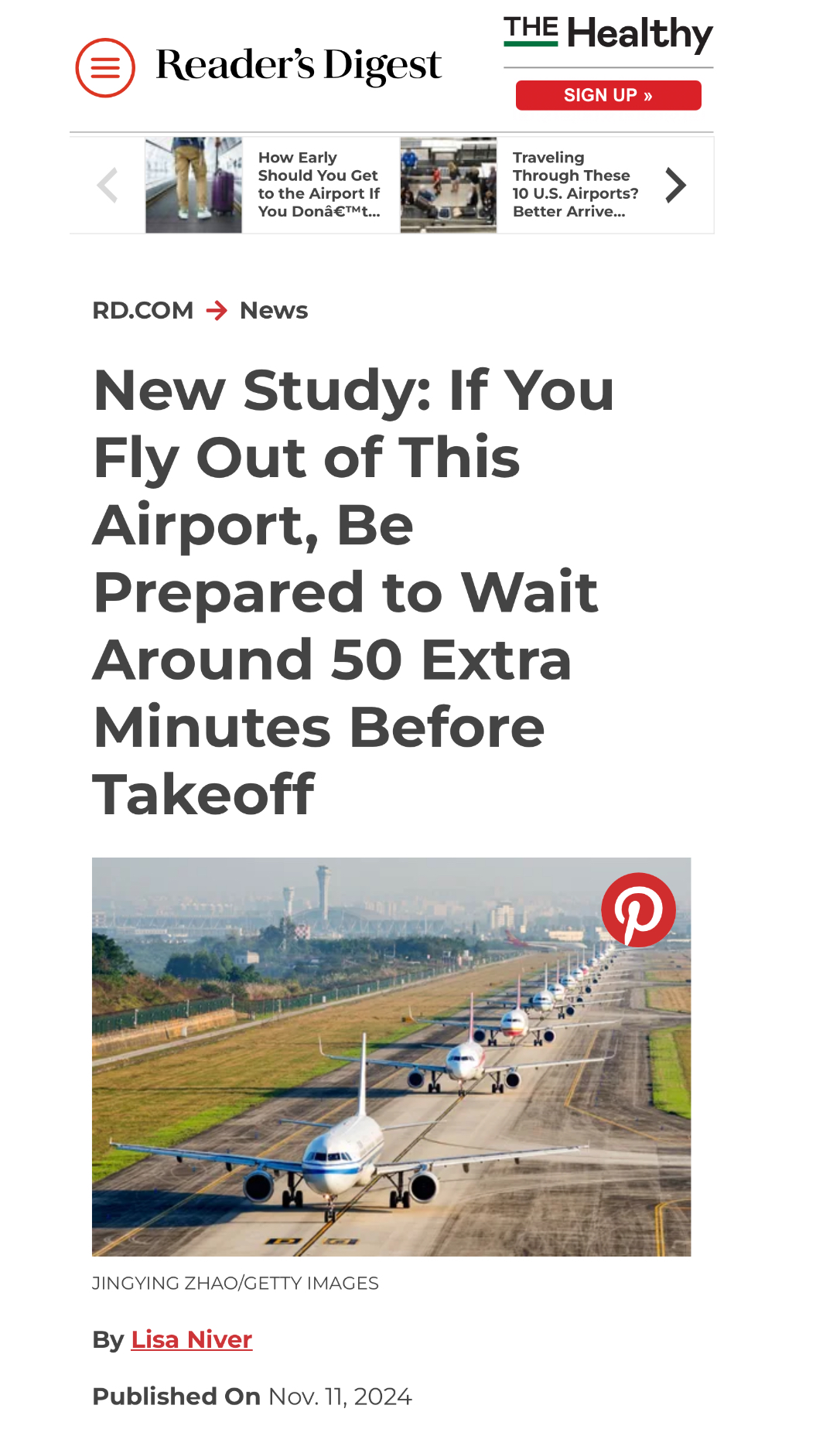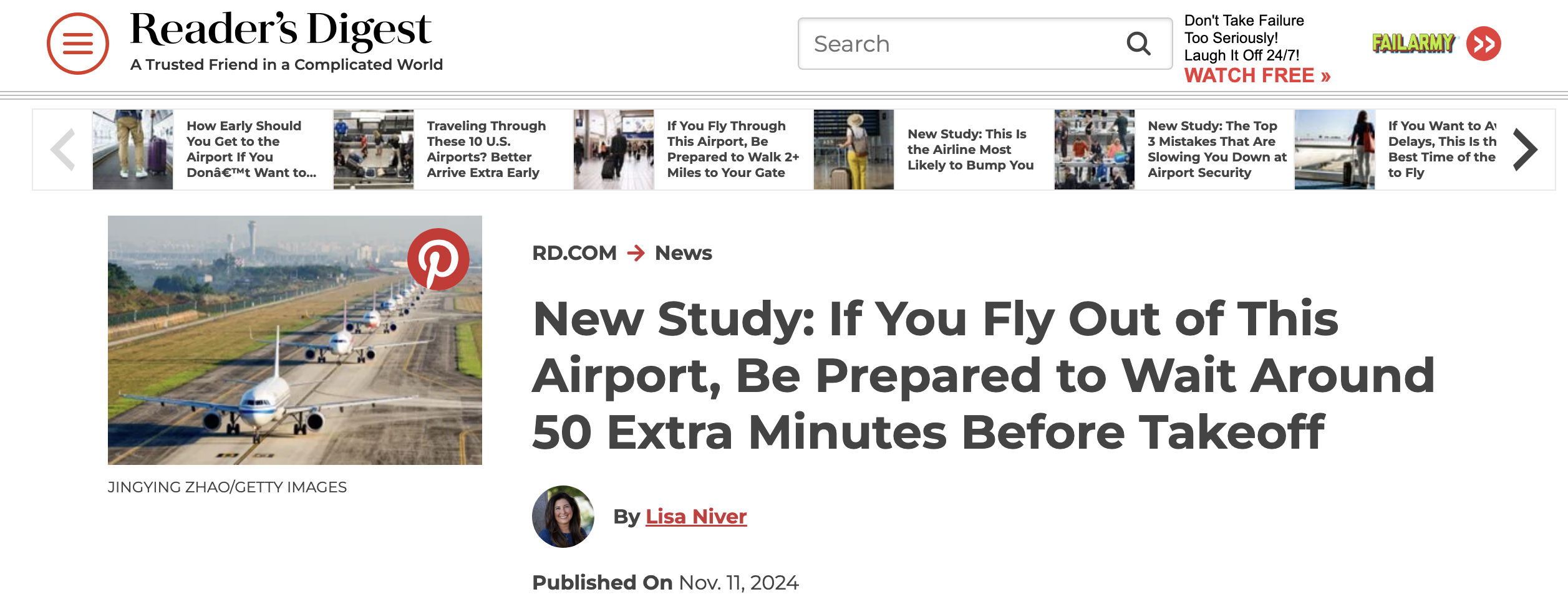 Upgraded Points: ���Airports Where Passengers Can Expect to Waste the Most Time [2024 Data Study]���Keri Stooksbury, editor-in-chief of Upgraded Points; email interview, Nov. 5, 2024More from LISA at Reader���s Digest