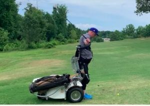 This summer, I was able to experience the equipment that got me back to “normal” golf. I was able to use the ParaGolfer in South Carolina. This all-terrain wheelchair helped raise me to a standing position and hit the ball. This also allowed me access to the putting surface and gave me the opportunity to play a full round of golf.