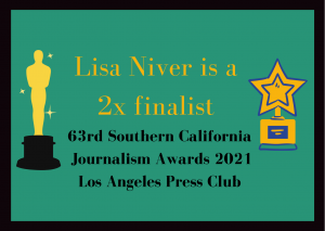 Lisa Niver has won many awards! From 2017 to 2021, in the Southern California Journalism Awards and National Arts and Entertainment Journalism Awards, she has won four times and been a finalist seventeen times for a variety of broadcast, print and digital categories.