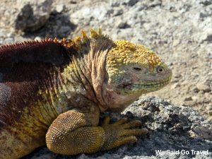 The South Plaza islands were incredible; in the morning, we saw yellow land iguanas, swallow-tailed gulls and colorful sesuvium portulacastrum. There were seven baby sea lions playing together in a pool of water. I could not stop taking photos and video of them. They were adorable. It was like sea lion day care! There were iguanas jumping up onto the Opuntia or prickly pear cactus leaves for a juicy bite. Some of them were suspended in air while chewing! Two iguanas had a pushing match and that was all before our walk island the island.