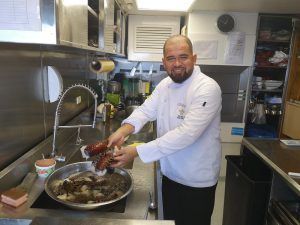 Work starts at 5am and is non-stop until 10pm at night – my only rest is a 30 min lunch break squeezed in sometime in the afternoon.  I have one sous chef who works with me and the two of us are responsible for all meals on board (for guests and crew). The hours are long and the work is hard, but I’m on a “6 week on / 6 week off” rota which certainly helps.
