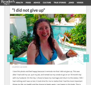 I love this photo and feel happy because it reminds me that I did not give up. This was after I had sold my car, quit my job, and rented out my condo to go on an 18-month trip with my husband. On the trip, I chose to leave my marriage and return to the states; I felt I had nothing and I was so lost. It took time for me to realize that I had the most important things my life: my health and the chance to begin again. I am happy in this body. This is what 50 looks like.” —Lisa Niver, Travel Writer, We Said Go Travel