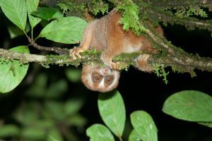 Philippine slow loris surprised to see people at night on Kinabatangan River in Borneo