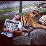 “You are petting tigers, my friend?” A male staff member asked me. My face was pressed against the cage. My fingers clutched the cage and I felt like a child at the zoo for the first time. I turned to the employee and nodded. “Come this way.” He opened a door, closed it, and then opened the second door leading into the enclosure. My heart raced. I was fresh flesh amid five eight-hundred-pound beasts. The employee, who wore tattered jeans and a Tiger Kingdom shirt, smiled at me as he pointed to one of the tigers. “This is Big Joe. Please, lie down,” he said, gesturing me to lie on the tiger.