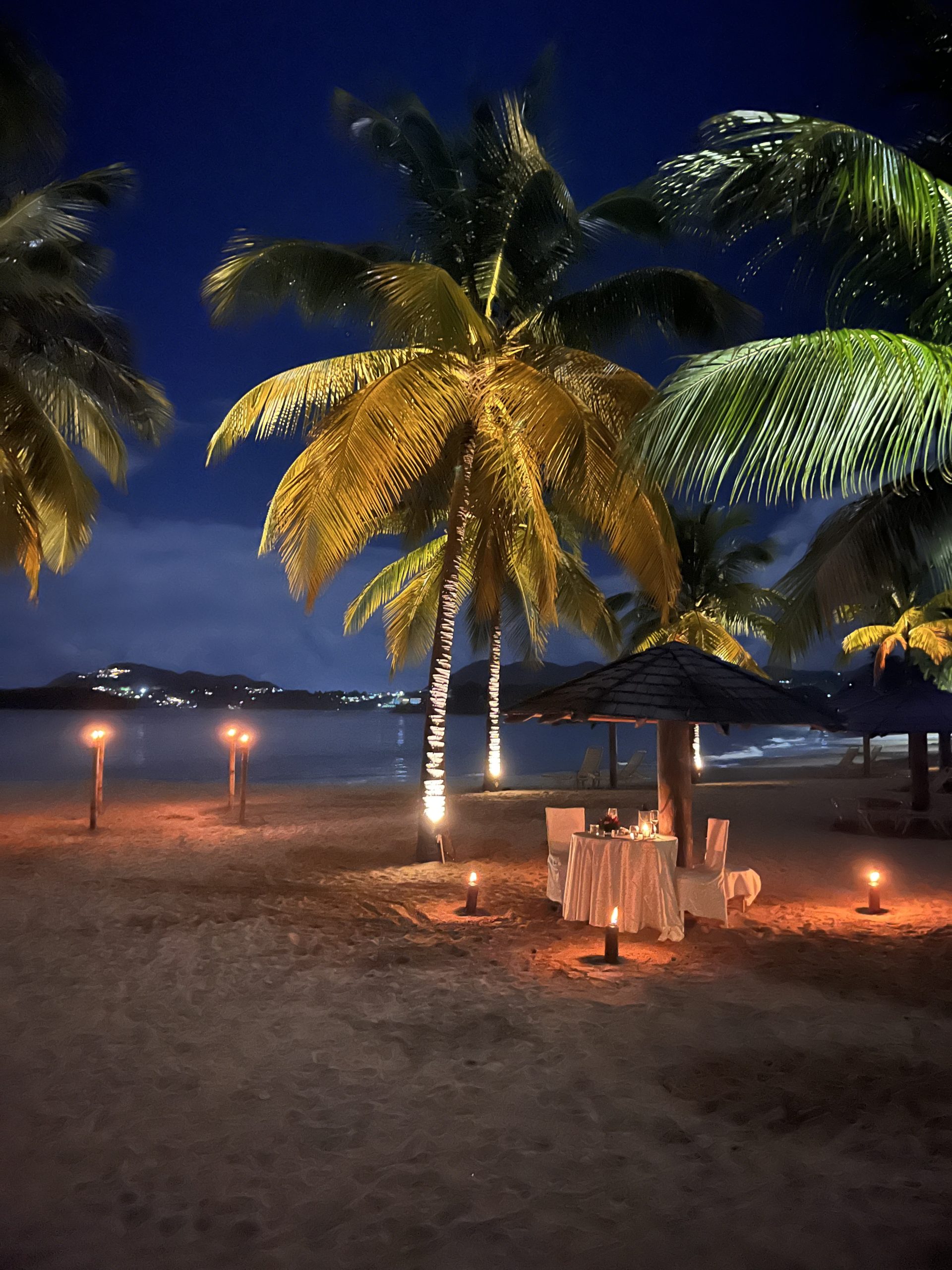 Our most special meal was the private ���Dinner Under the Stars��� that Sandra helped me to arrange (an extra charge). As the sun melted behind the ocean and the first points of light started to dust the evening sky, Matt and I strolled a tiki-torch lined path to our pop-up table on the beach for a truly romantic dinner that included dorado mille-feuille and chocolate dipped-fruit. We had our own waiter and a private patch of beach that was all ours for the evening.