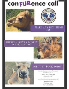 Want to liven up your next video conference meeting? Planning a FaceTime with friends or virtual birthday party? Sign up to have one of our amazing animals join the call! We also offer virtual tours with several animals. We’ll join the meeting do a quick intro of the sanctuary then you can ask questions or just hang out. Your call will be with Greener Pastures or our affiliate, A to Zoo Education.