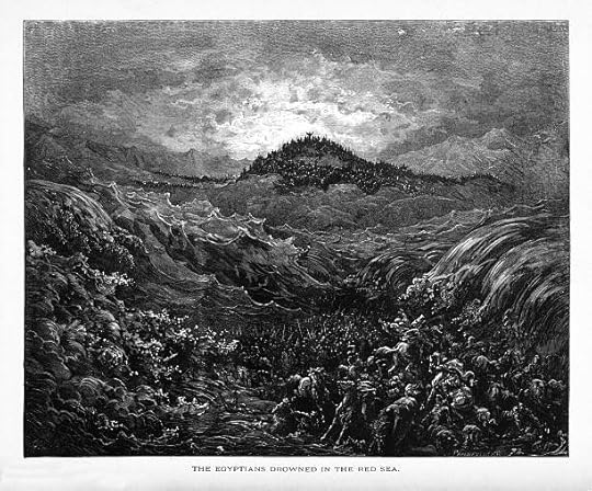Rare and beautifully executed Engraved illustration of Moses and the Drowning of the Egyptians Biblical Engraving from The Popular Pictorial Bible, Containing the Old and New Testaments, Published in 1862. After Moses led his people through the Red Sea, the Egyptians drowned as the waters returned. Copyright has expired on this artwork. Digitally restored.