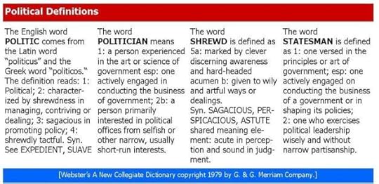 Think about it: politics aren’t limited to civil government. Politics are essential in any government, family, office, even the government of the gospel. Consider the definition of politics as it applies to the Christian’s duty to share the gospel. A Christian is to be shrewd in managing and dealing with the facts, while tactfully promoting and convincing others about the Truth. Politics are essential and necessary in any effort where issues of promoting policy, ideologies, philosophies, preferences or matters of faith are exchanged. Politics are essential in the art of persuasion and the science of logic and reason.