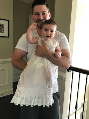 Last weekend we went to my son's for my grand baby's christening. Here's a picture of my son and Charlotte wearing a slip from the gown that her great-great grandmother made. It's 100 years old and traditionally every baby has been baptized in it.