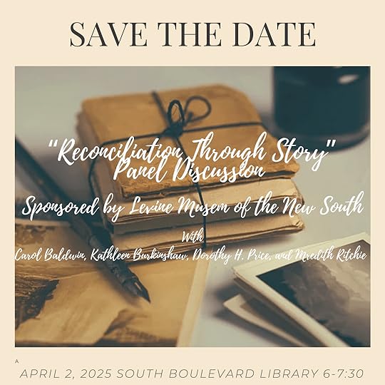 And if you’re in Charlotte, I hope you can join me and three other local authors on April 2 — National Reconcilation Day for a panel event sponsored by the Levine Museum of the New South.