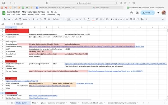 I use google sheets to keep track of who I am contacting, when, and any notes about the contact. Here is what my “Media Outlets” page looks like. I highlight people I need to follow up with and important dates. I’m probably a little extreme about this, but I have pages for ARC readers, Awards, Bookstores, Conferences, Community Groups, Endorsements, Fairs & Events, Homeschool, Libraries, Museums, Schools, Senior Centers (because I’m counting on a crossover market with seniors), and Trade Reviews.
