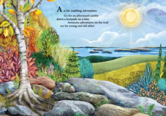 T is for Trails: A Hiking Alphabet written by Judy Young and Illustrated by Sharisse Steber, (Sleeping Bear Press) is an engaging and educational book that introduces young readers to the wonders of hiking and the natural world through an A-to-Z exploration of hiking-related themes. The structure of the book is fun in that it combines both informational content and poetic elements, giving it a versatile appeal for different types of readers.