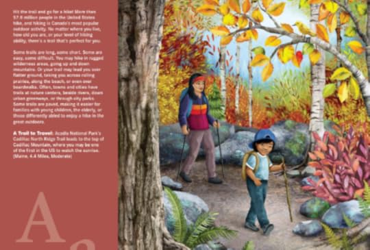 The first alphabetic spread sets the stage by highlighting the popularity of hiking in both the United States and Canada. It provides important context by mentioning the diverse range of trails available, from rugged mountain hikes to urban greenways, and how hiking can be accessible to everyone, regardless of age or physical ability. This opening helps frame the significance of hiking as a universal activity that promotes exploration, health, and well-being.