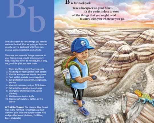 Each subsequent letter follows a similar pattern, presenting a diverse range of hiking experiences, from basic concepts like B is for Backpack: The letter “B” introduces the essential hiking gear—a backpack. With a poem and description, the book explains how a backpack is used to carry everything needed for a hike, from snacks to water to extra layers. It emphasizes the importance of being prepared for the journey, making it an essential part of the hiking experience.
