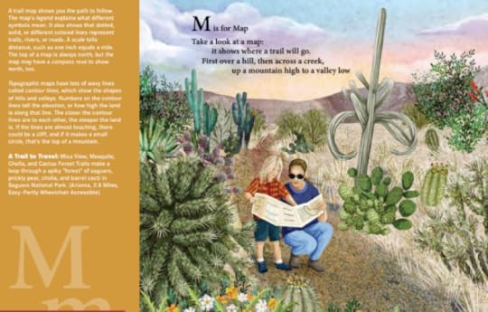 M is for Map: The letter “M” focuses on maps, introducing children to the skill of navigating trails. This section explains how a map can help hikers find their way, discover points of interest, and make the most of their outdoor adventures. It teaches the value of being able to read a map, making it both a fun and practical lesson in outdoor navigation.
