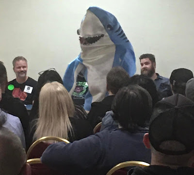 Hey, there, cats and kittens! Make sure you hop over to ye olde grouppe blogge for a rundown on my time at the very first Scares That Care AuthorCon. Who did I meet? Who did I spill coffee on? Will there be another one? The answers to all this and more can be found only by clicking here or on the shark's face below: