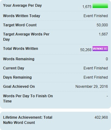 So it probably seems a little late now, but here's a little check-in on my NaNoWriMo this year. I did, indeed, win, as I have every year since I started in 2009. For those of you interested in my statistics, here they are: