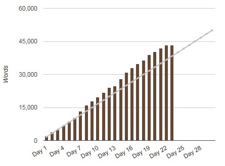 So, this is a snapshot of my graph as of today. Obviously, the x-axis is the number of days and the y-axis is the wordcount. The gray line represents what you need to make par (1667 words per day, or enough to make up that amount.) The brown bars represent what you actually typed.