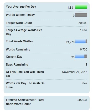 He he, I just plugged that in and the result is pretty hilarious. It projects that at my current rate I won't finish until May 11, 2016. (Hey, that's what I get for only writing 260 words a day.) But more to the point, it tells me I can still win if I write 5500 words a day for the next week. I mean, that's daunting, that's especially daunting to me since I've never written that many words in a day before, but the NaNo bots never count me out. I think that's pretty cool, all things considered.