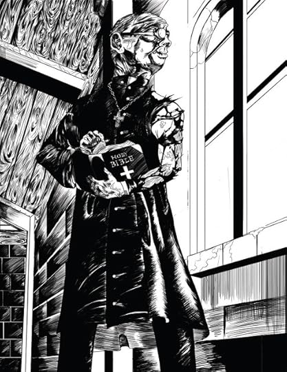 Drumroll please! It's the penultimate post before next week's final artwork reveal here on the blog, and then the full GHOUL ARCHIPELAGO trailer reveal over on THe GaL iN THe BLue MaSK. But let's not get ahead of ourselves. There's still a gorgeous piece of artwork to salivate over (er...sort of...if you're not thrown off by zombie arms) this week: one of the most dreadful villains I've ever conceived, the crazed religious zealot Reverend Sonntag!