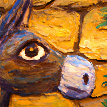 donkey's big brown eyes peer over the chipped stone wall; waiting to turn right