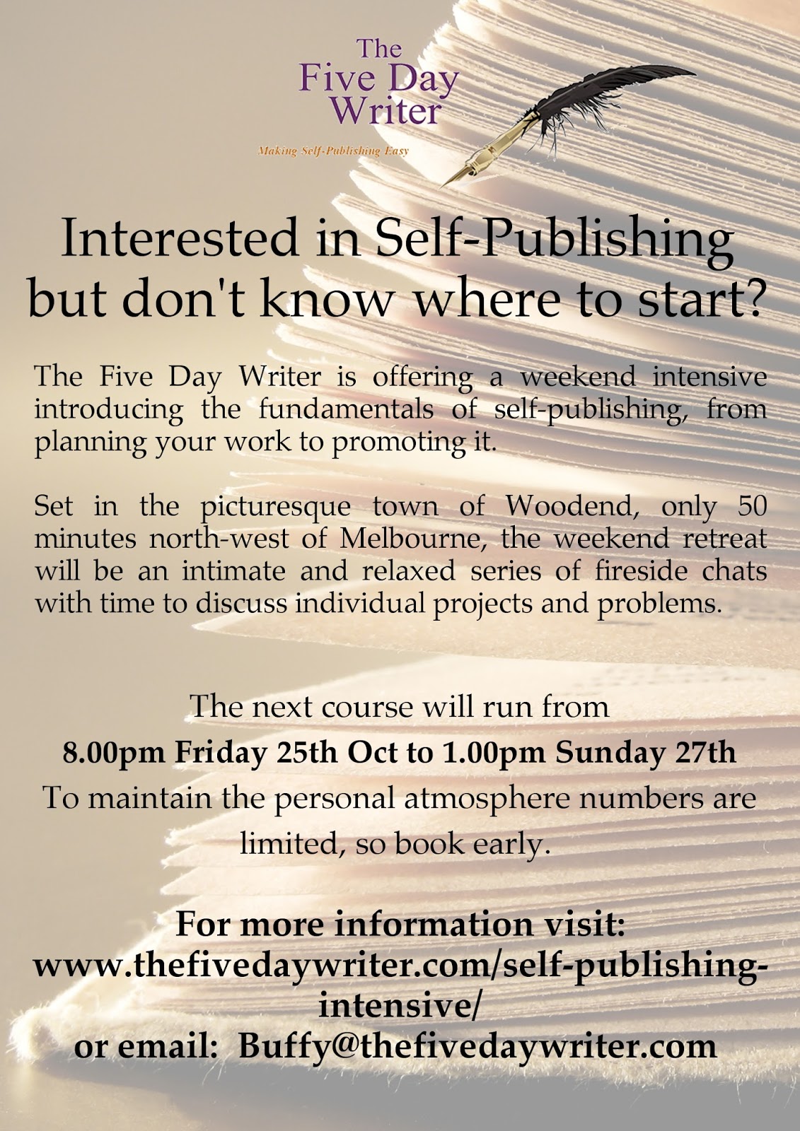 Details: Friday 25th Oct 8pm - Sunday 27th 2pm, in Woodend, which is 50 minutes north-west of Melbourne. Topic: The Fundamentals of Self-Publishing. Current cost is $250 for the weekend, including meals but not including accommodation. It is going to be a really relaxed, intimate weekend where you get to talk about your writing and authorship dreams.