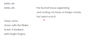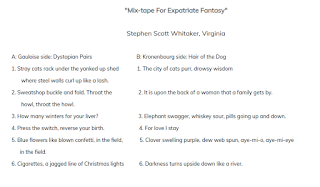 Grateful thanks to AvantAppal(achia) for including two experimental poems in their new winter issue. One, "Mixtape..." is meant to be read track to track, so to speak. Track one of one side goes with Track one of the B side, etc. The other "Fireman Down" is written for two speakers. I've had a lot of interest in these multi-voiced poems from editors etc, but the formatting is a pain in the %^&$. Editors beware indeed.