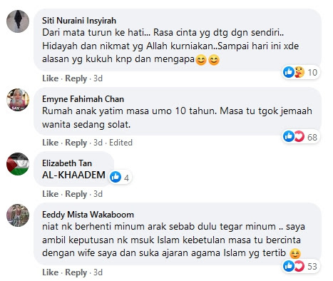 Adni KitTengIf it’s kenal Islam, sejak zaman sekolah melalui kawan2 Melayu. But betul2 memahami Islam, bermula di tempat kerja. Rakan sekerja buka Quran dan ceritakan tentang kejadian alam, syariat kita sebagai hamba di dunia dan dunia akhirat setiap pagi sebelum makan sarapan pagi. Then baru diri ni yang dulu benci sangat Islam sedar bahawa ciri2 Islam yang dibenci tu bukannya ajaran Islam yang sebenar. Silap diri ini anggap apa yang dipamerkan oleh orang Islam di sekeliling sebagai ajaran Islam berlandaskan al-Quran.Alhamdulillah sejak tu mula baca terjemahan al-Quran dan mula praktikkan ajaran Islam sebelum mengucap syahadah. Perbezaan yang sangat besar dirasai waktu belum Islam lagi tapi beranikan diri cuba bertudung dan menutup aurat gi kerja. Saya kerja dalam bidang muzik, bidang hiburan so maklumlah memang jarang orang jaga batas pergaulan. But masyaaAllah terkejutnya saya bila alami sendiri apa yang sehelai tudung di kepala boleh ubah! Majikan saya (yang merupakan seorang Muslim Melayu) biasanya akan sentuh-menyentuh dan memegang pinggul bila kami bincang tentang kerja, tapi pada hari pertama saya bertudung di tempat kerja, dia hulurkan tangan untuk berjabat tangan pun sendiri tarik balik tanpa saya perlu kata apa2. Aisya Humaira LeeMasa secondary school. Masa form 4.. perasaan mencari tu datang dari hati. Bermula dari ingin tahu. Until 1 day sya realize then sya start mencari ...... sya start beli buku2 ttg agama islam, tahun 2015 sya jumpa seorang lelaki melayu asal dari semenanjung duda dan ada anak. dia guide sya ttg agama sampai sya betul2 faham & mula sayang dengan Islam. Dia selalu bercetita tentang agama & nabi2, dia slalu cerita tentang pahala , tentang kebaikan, tentang hikmah. Until then, Finally sya revert pasa tahun 2017 dan selepas beberapa bulan sya revert dia lamar sya. Now kami dah ada 2 anak sendiri. Dan termasok anak dia sblom ni, kami ada 5 anak. Dan dia masih selalu bercerita tentang agama, nabi2 & hidayah, dia juga selalu pasangkan ceramah dari ustaz2 dengar bersama. Love by heart not love by DNA.